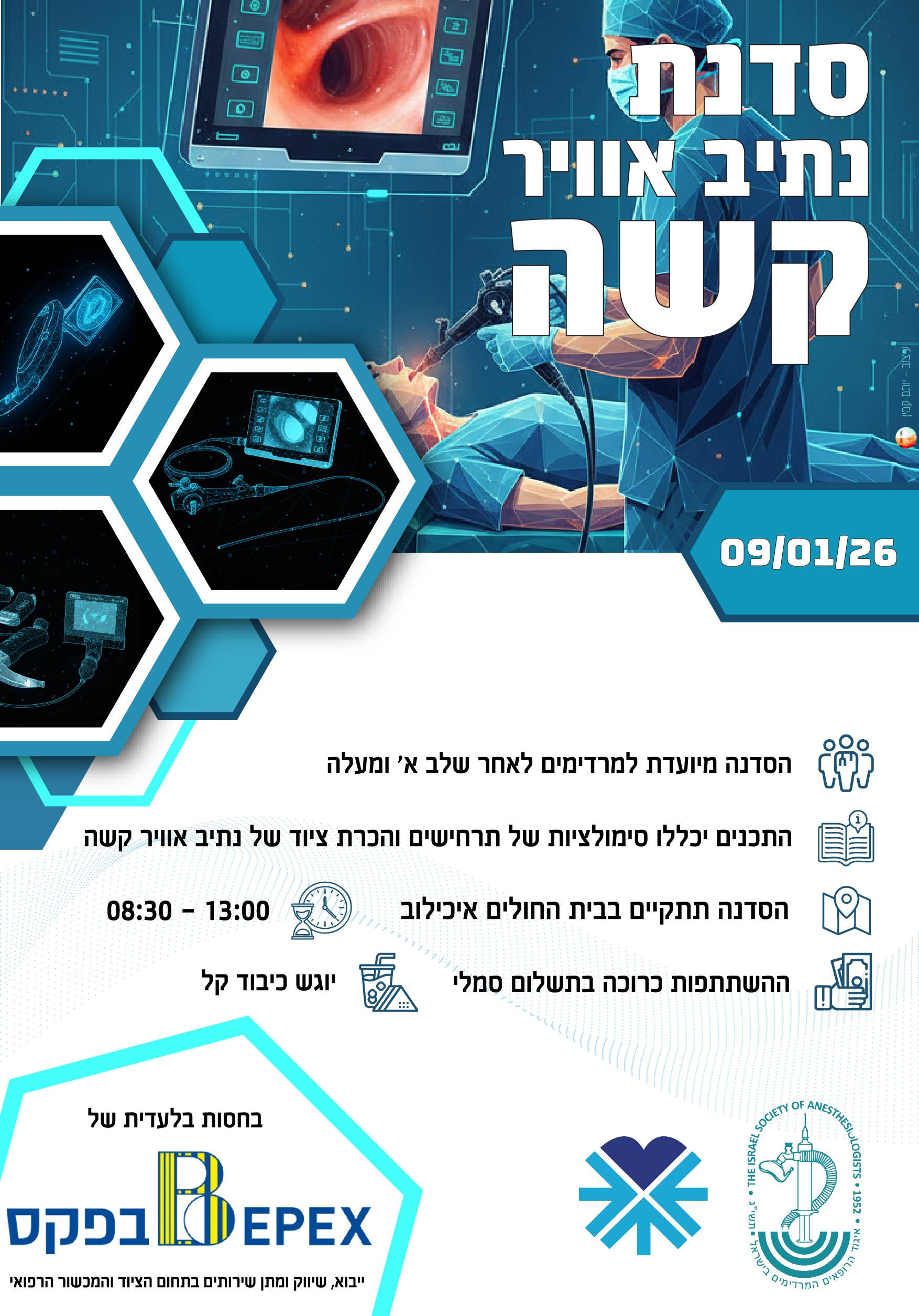 איגוד הרופאים המרדימים שמח להזמין אתכם לסדנת נתיב אוויר קשה שתתקיים ב-9.1. שימו לב - עלות ההשתתפות בסדנה הינה 100 ש"ח, והתשלום מהווה תנאי להשתתפות. מספר המקומות מוגבל.
